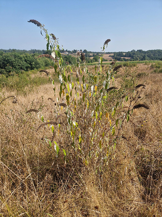 Après plusieurs années d’abandon agricole, le Buddléia de David (Buddleja davidii, cf. photo) a colonisé plus d’un tiers de la prairie (4000m² environ) au détriment du cortège floristique prairial. Quelques pieds d’Herbe de la Pampa (Cortaderia sp.) et de Laurier palme (Prunus laurocerasus), s’installaient aussi tranquillement sur le site.
